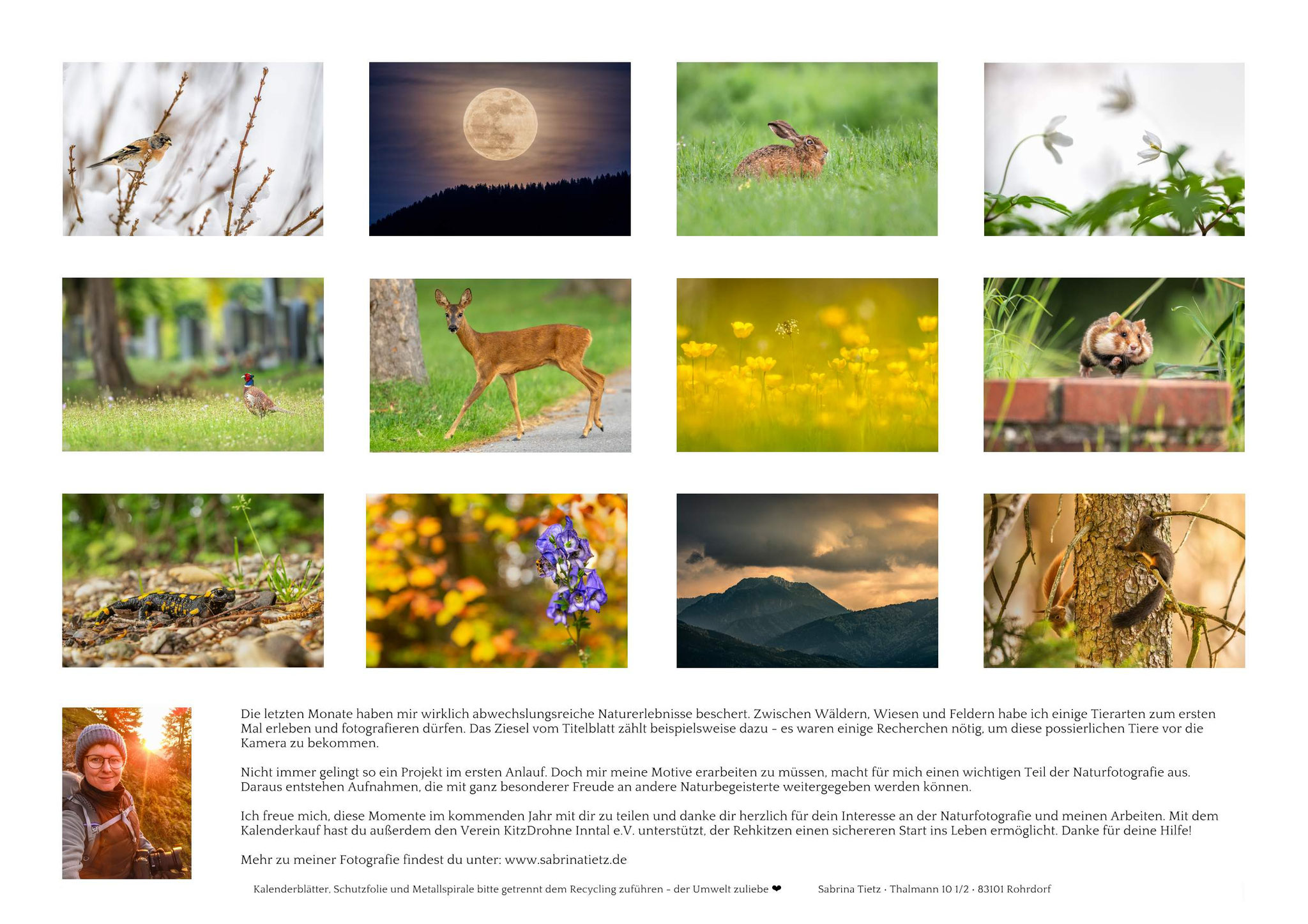 Das Besondere: Nach Deckung der Druckkosten gehen alle Einnahmen (ca. 15 EUR je Kalender) an den Verein KitzDrohne Inntal e.V., der sich der Rettung von Rehkitzen vor Landmaschinen verschrieben hat. Die Kitze werden mit hohem technischen Aufwand per Wärmebilddrohne geortet und anschließend aus den Wiesen getragen. So können Landwirt:innen sicher sein, dass bei ihren Mäharbeiten kein Tier zu Schaden kommt. Ich würde mich sehr freuen, diesen Einsatz mit deiner Hilfe zu unterstützen.